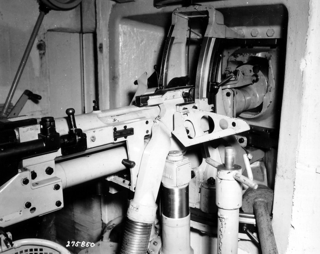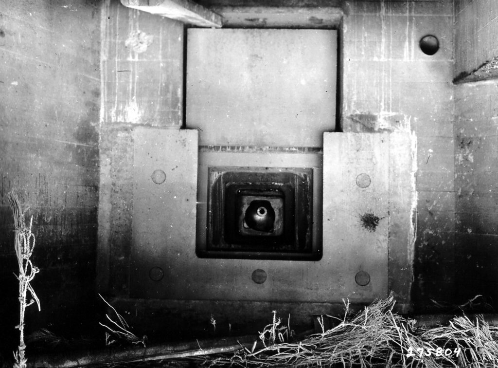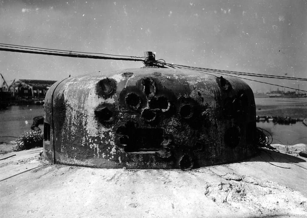 O aço pesado dessa cúpula é marcado por muitos disparos de grosso calibre, provavelmente a partir de um tanque dos EUA ou destroyer.